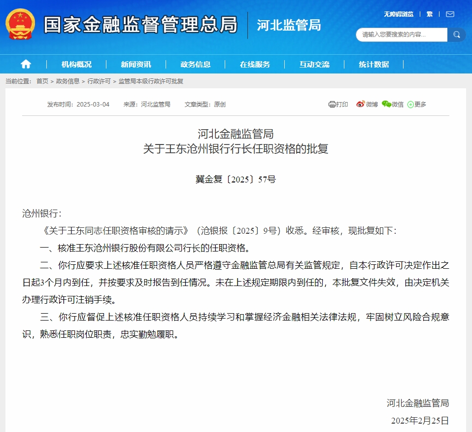 据国家金融监督管理总局网站显示,河北金融监管局核准王东沧州银行行长的任职资格。