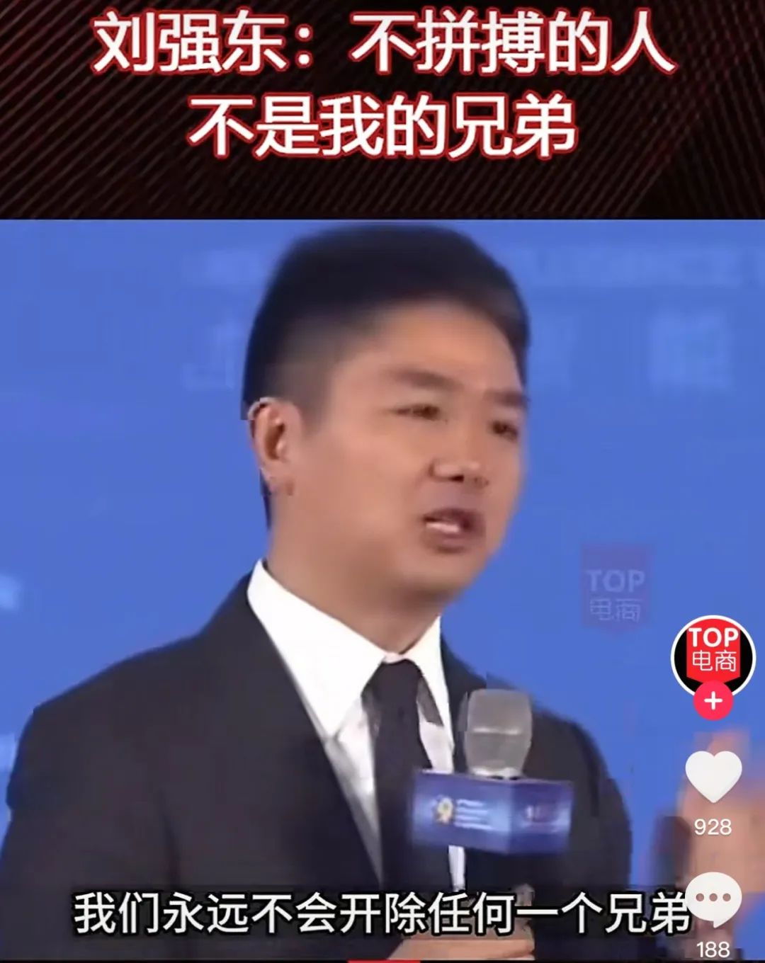 但刘强东的“兄弟论”也处于不断进化中。以前说“我们永远不会开除任何一个兄弟,只要员工不贪污,永远不会开除他们”。现在说“业绩不好又从来不拼搏的人,不是我们的兄弟,你是路人。”