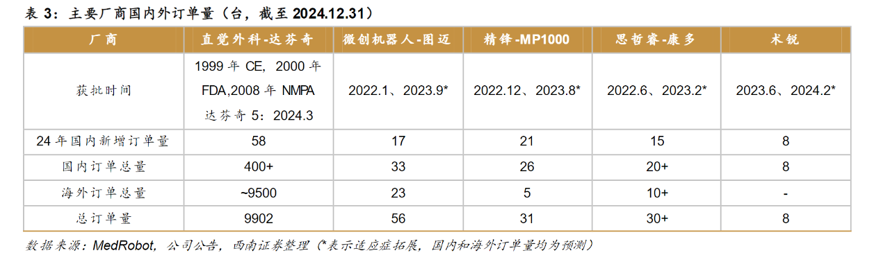 从腹腔镜手术机器人新增订单量来看,据西南证券研报,2024年,图迈腔镜手术机器人国内新增17台订单量,要低于精锋医疗四臂腔镜手术机器人MP1000的21台。但从国内订单总量来看,图迈腔镜手术机器人为33台,为国产厂商首位。