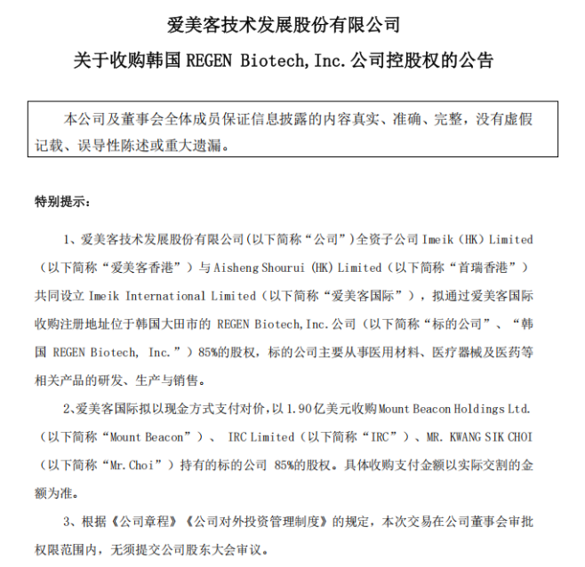 3月10日晚间,医美巨头爱美客发布公告称,公司全资子公司爱美客香港与首瑞香港共同设立爱美客国际,拟通过爱美客国际以1.9亿美元(约合人民币13.79亿元)收购韩国REGEN Biotech公司85%的股权。
