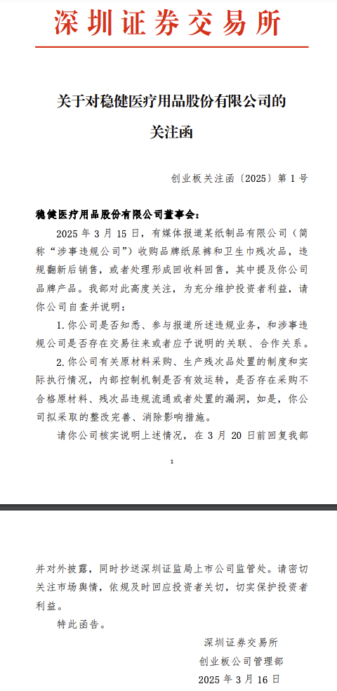 3月16日,深圳证券交易所创业板公司管理部向稳健医疗下发关注函,要求自查并说明公司是否知悉、参与报道所述违规业务,和涉事违规公司是否存在交易往来或者应予说明的关联、合作关系;公司有关原材料采购、生产残次品处置的制度和实际执行情况,内部控制机制是否有效运转,是否存在采购不合格原材料、残次品违规流通或者处置的漏洞,如是,公司拟采取的整改完善、消除影响措施。