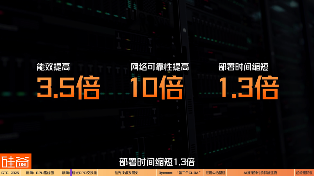 与传统网络相比,可将现有能效提高3.5倍,网络可靠性提高10倍,部署时间缩短1.3倍。这能极大程度增强英伟达数据中心的互联性能,对于实现未来百万级GPU的AI工厂的大规模部署来说至关重要。