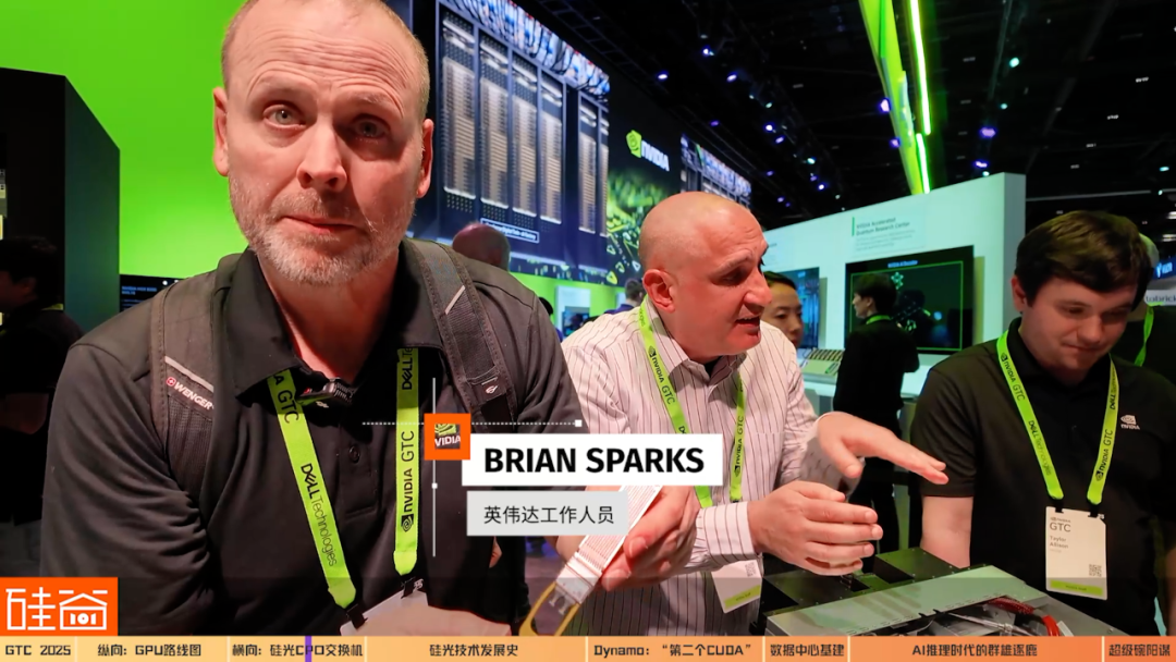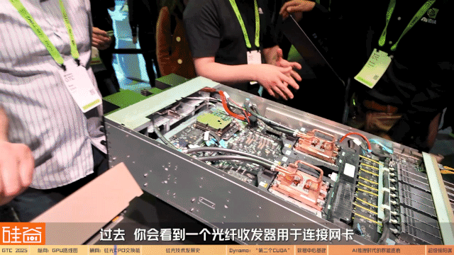 除了速度快之外,CPO交换机也能在能耗和价格上带来很多成本的节省。在GTC现场,英伟达的工作人员展示了CPO实物是如何运作的。