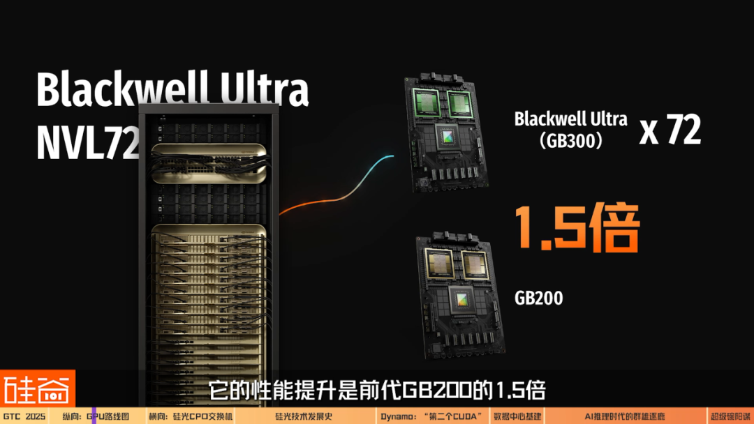 2025年下半年出货的Blackwell Ultra NVL72连接了72块Blackwell Ultra GPU,它的性能提升是前代GB200的1.5倍(这里要注意一下,黄仁勋在Keynote中又重新定义了“黄氏算法”:从Rubin开始,GPU数量是根据“封装中的GPU数量”,而不是“封装数量”来计算的;所以按新的定义,Blackwell Ultra NVL72算是有144个GPU)。