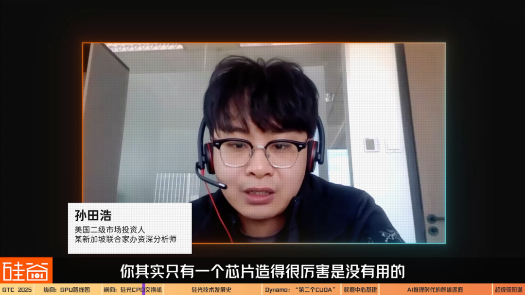 你如果只有一个芯片,把它打造得再厉害也是没有用的。本质原因是我们现在做推理、训练,都是用几万个卡在一起的集群,比如Grok可能就一下就用 20 万个卡一起训练。重要的是怎么能让几万个、十万个 芯片高效地协同运作。在这个互联领域英伟达又再一次地领先了全球,因为它有CPO,它的机柜上有各种各样的新花样。所以我觉得从长线来看,英伟达在推理集群领域的优势也是更明显的。