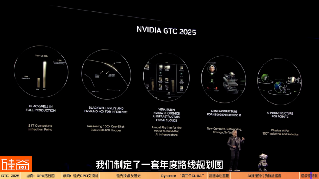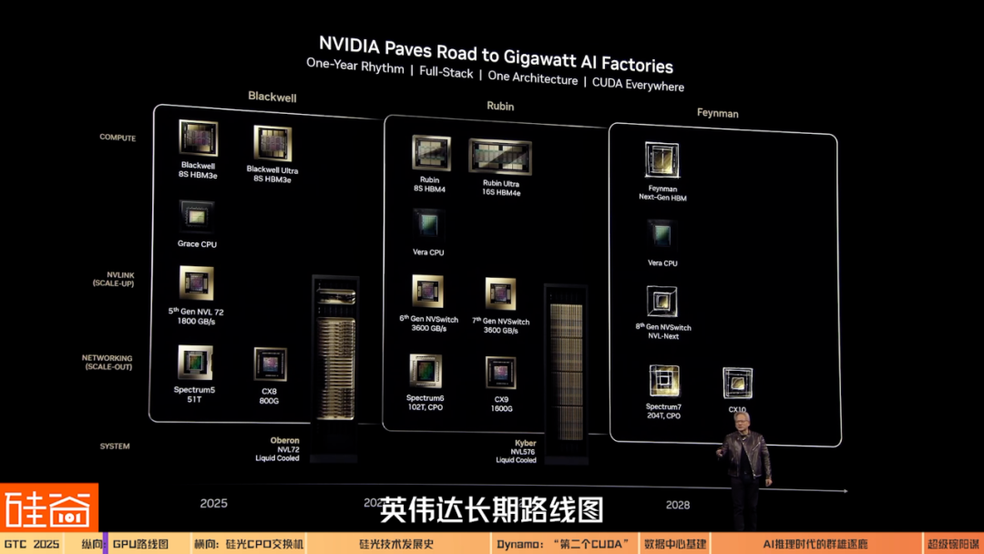 在Keynote中,黄仁勋给出了非常清晰的英伟达长期路线图,包括从当前的Blackwell到未来的Blackwell Ultra、Vera Rubin、Rubin Ultra,最终到2028年的Feynman架构。
