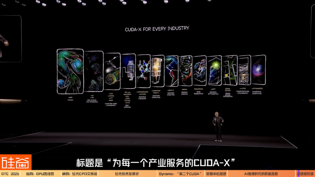 让我们记忆很深刻就是:在这一次的演讲当中,黄仁勋背后出现这一排像塔罗牌一样的全生态布局,标题是“为每一个产业服务的CUDA-X”。包括数值计算、计算光刻、5G/6G 信号处理、决策优化、基因测序、医学成像、天气分析、量子计算、量子化学、深度学习、计算机辅助工程、数据科学和处理、物理学等等。