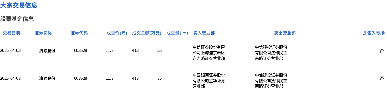 4月3日,清源股份大宗交易成交70万股,成交额826万元,占当日总成交额的7.4%,成交价11.8元,较市场收盘价12.84元折价8.1%。
