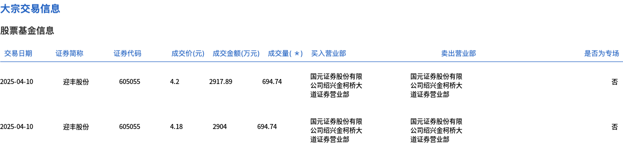 4月10日,迎丰股份大宗交易成交1389.48万股,成交额5821.89万元,占当日总成交额的62.65%,成交均价4.19元,较市场收盘价4.93元折价15.01%,其中最高成交价4.2元,最低成交价4.18元。