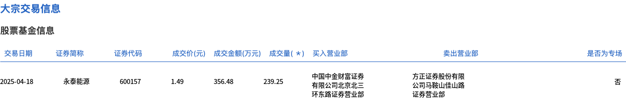 4月18日,永泰能源大宗交易成交239.25万股,成交额356.48万元,占当日总成交额的1.06%,成交价1.49元,较市场收盘价1.36元溢价9.56%。
