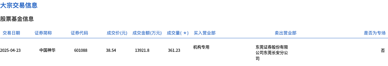 中国神华今日大宗交易平价成交361.23万股,成交额1.39亿元