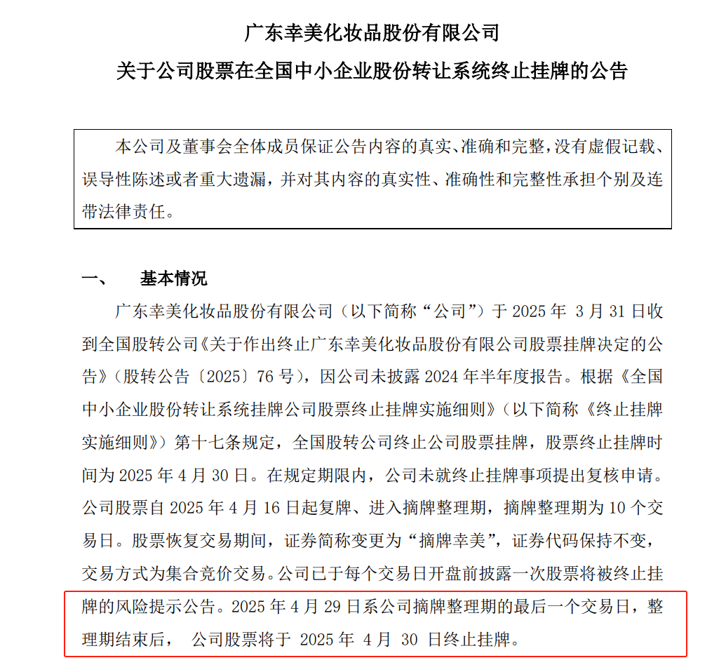 前不久,幸美股份对外发布公告,称公司股票自2025年4月16日起复牌、进入摘牌整理期,摘牌整理期为10个交易日。4月29日系公司摘牌整理期的最后一个交易日,整理期结束后,公司股票将于4月30日终止挂牌。这标志着,幸美股份长达11年的资本市场征程正式落幕。