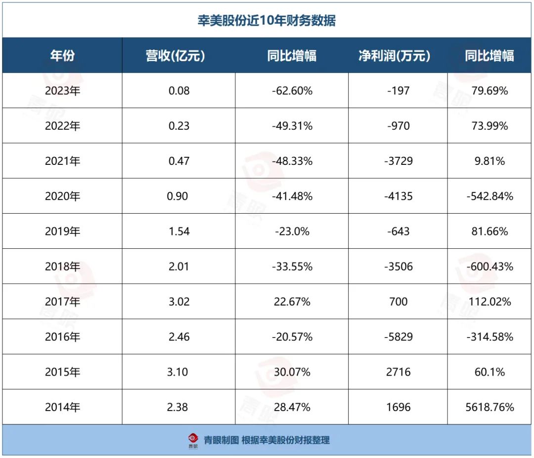 结果却不如人意。2018年开始,幸美股份非但没有如期维持增长,反而开始走下坡路。财报显示,2018年至2023年,幸美股份持续亏损,累计亏损额达1.3亿元。