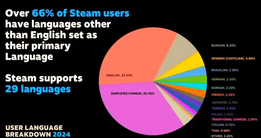 一个显著表现是,在Steam这样一个PC游戏为主的平台上,中国玩家数量在逐渐攀升:按照2024年全年的“Steam用户主要语言设置”的统计显示:全年内将简体中文设置为首选语言的用户(中国玩家),占比位居榜首,达到33.7%。