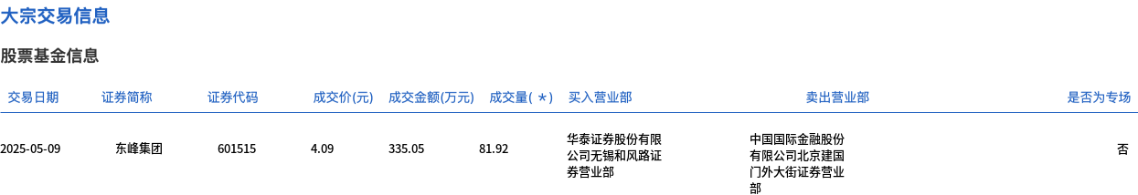 5月9日,东峰集团大宗交易成交81.92万股,成交额335.05万元,占当日总成交额的2.25%,成交价4.09元,较市场收盘价4.09元持平。