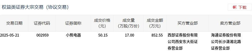 小熊电器今日大宗交易折价成交17万股,成交额852.55万元
