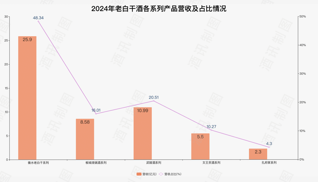 分产品来看,2024年,老白干酒旗下衡水老白干系列的营收为25.90亿元,在总营收中占比为48.34%。剩下的“半壁江山”则由板城烧锅酒系列、武陵系列酒、文王贡系列酒、孔府家系列四大品牌支撑,报告期内实现营收分别约8.58亿元、10.99亿元、5.50亿元、2.30亿元,在总营收中占比分别约为16.01%、20.51%、10.27%、4.30%。