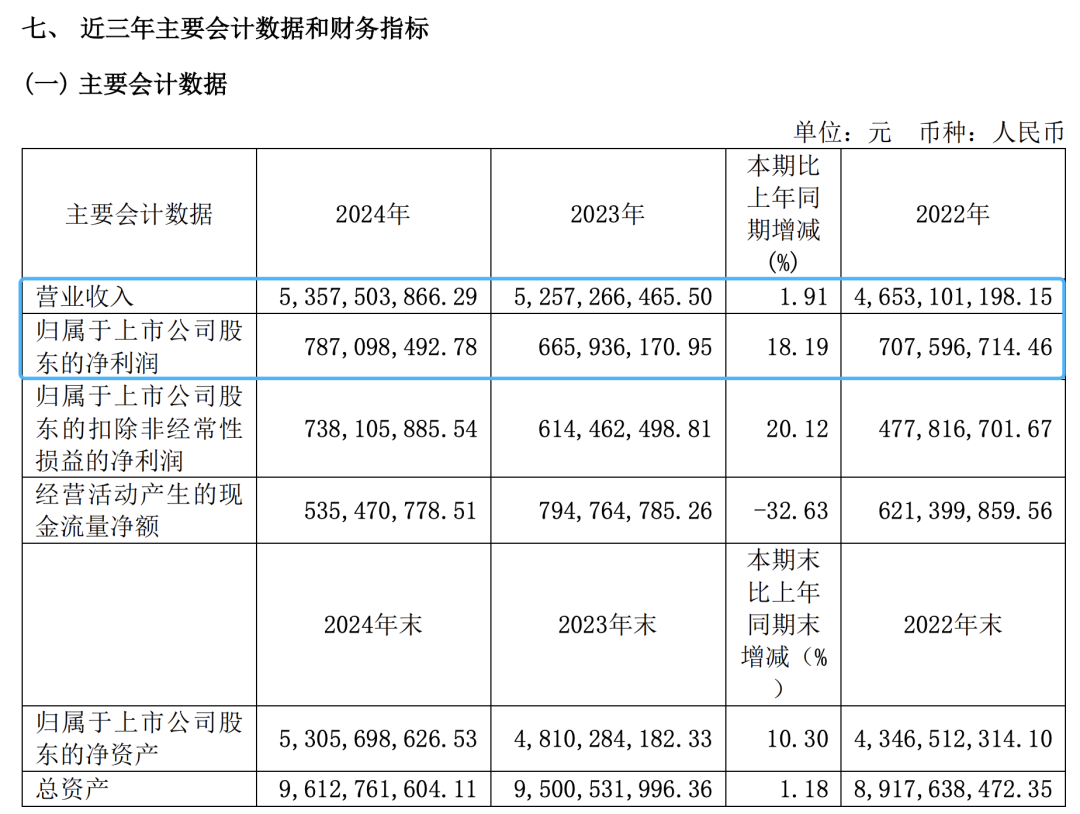 行业整体降速背景下,老白干酒收入微增在意料之中。不过值得一提的是,和营收微增形成对比的是净利润双位数的增长。2024年,老白干酒实现净利润7.87亿元,同比增长18.19%。