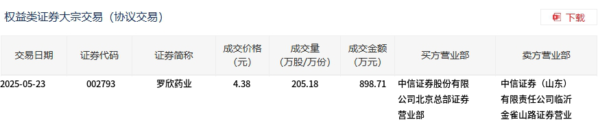 罗欣药业今日大宗交易折价成交205.18万股,成交额898.71万元