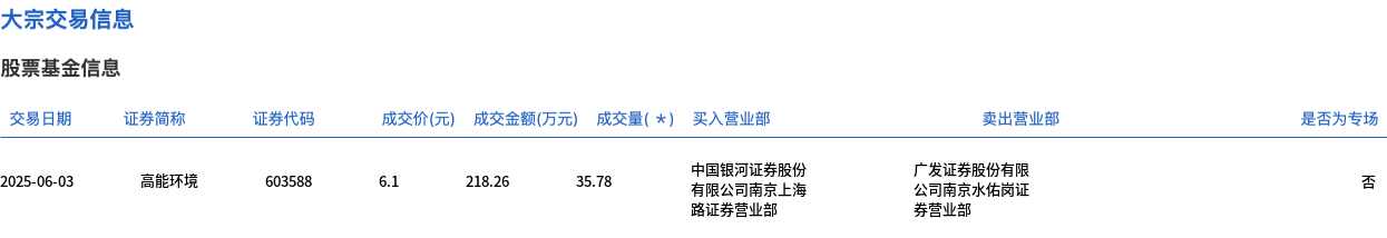 6月3日,高能环境大宗交易成交35.78万股,成交额218.26万元,占当日总成交额的1.53%,成交价6.1元,较市场收盘价5.69元溢价7.21%。