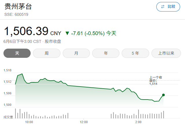 截至6月6日收盘,贵州茅台报1506.39元/股,下跌0.5%。今年以来,其股价下跌了1.16%,几近原地踏步。