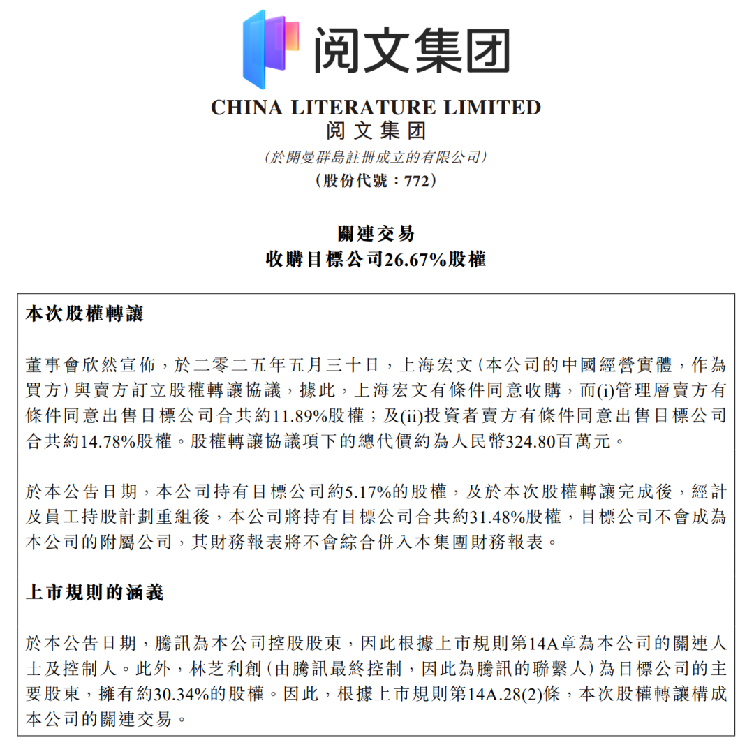 近日,阅文集团发布公告称,公司拟以3.25亿元收购艺画开天26.67%的股权,后者为热门动漫《灵笼》的制作方。在此之前,阅文已经持有艺画开天5.17%的股权,此次交易完成后,阅文集团将合计持有艺画开天约31.48%的股权。