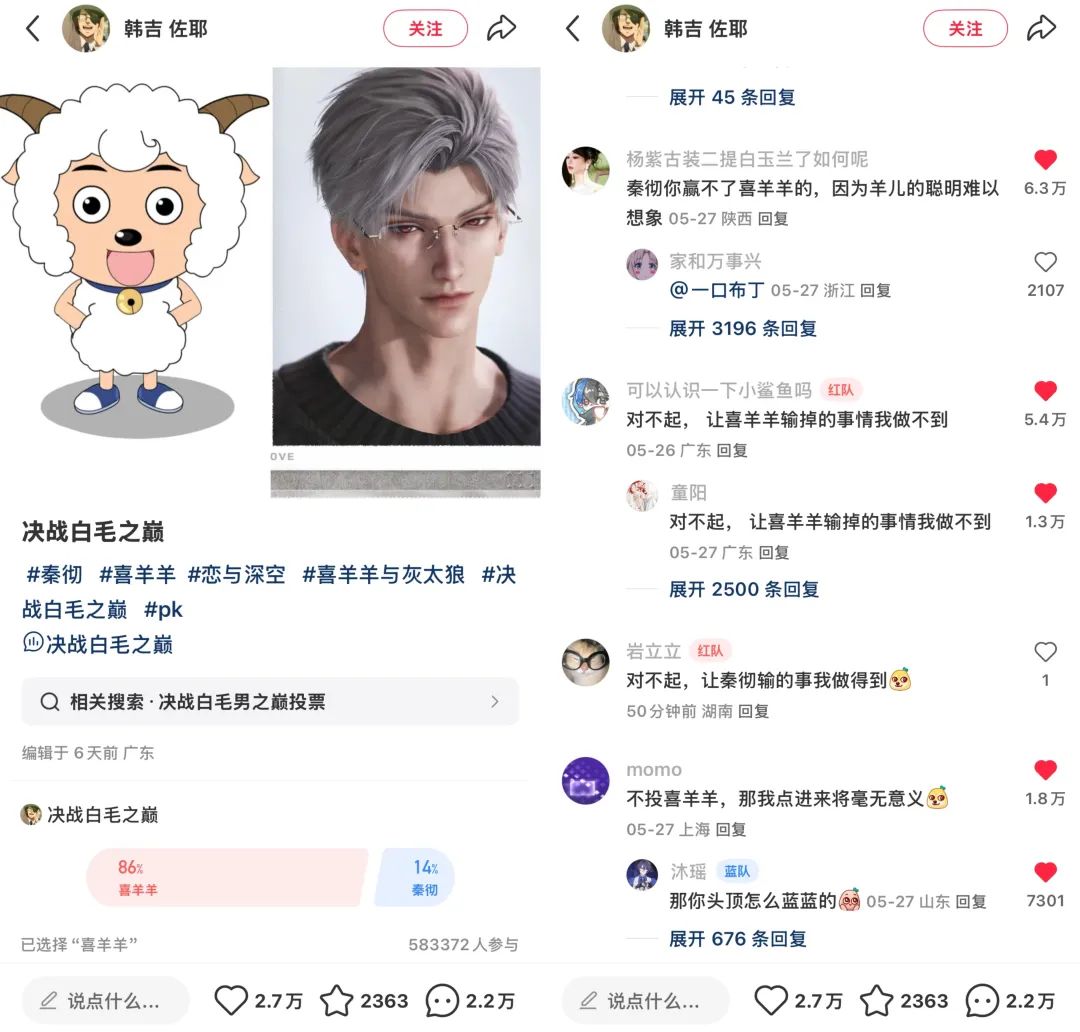 前两天我在小红书围观了“决战白毛之巅”的投票活动,58万人投得不知天地为何物,喜羊羊以86%的支持率当选冠军(当然,我也选了喜羊羊,毕竟是我的童年男神)。
