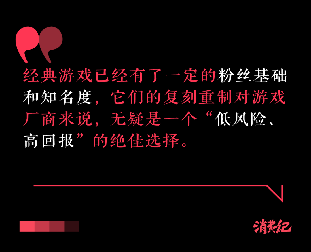 而从市场规律的角度看,经典游戏的复刻重制对游戏厂商来说,无疑是一个“低风险、高回报”的绝佳选择。开发一款全新的游戏,先不提市面上的竞品,光是需要投入的人力、物力和财力,这些成本可能高达上亿。而且新游戏还面临着市场接受度不确定的风险,要是玩家不买账,那可就血本无归了。