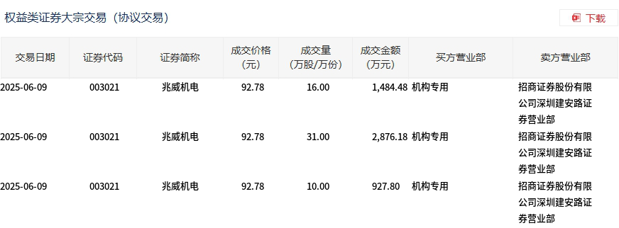 兆威机电今日大宗交易折价成交57万股,成交额5288.46万元