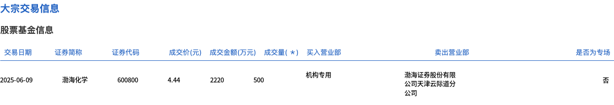 6月9日,渤海化学大宗交易成交500万股,成交额2220万元,占当日总成交额的2.85%,成交价4.44元,较市场收盘价4.53元折价1.99%。