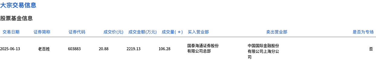 6月13日,老百姓大宗交易成交106.28万股,成交额2219.13万元,占当日总成交额的2.55%,成交价20.88元,较市场收盘价20.88元持平。