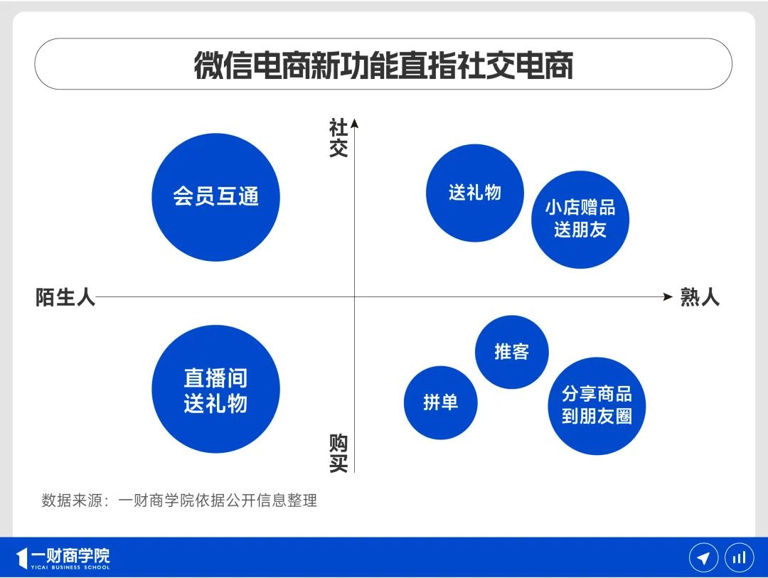 显然微信也并不打算依赖推客、拼单或者送礼物等单一功能做大电商规模,而是通过功能迭代与微信生态的融合,让微信小店逐渐成为人们做生意不可或缺的电商工具。