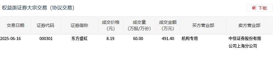 东方盛虹今日大宗交易平价成交60万股,成交额491.4万元