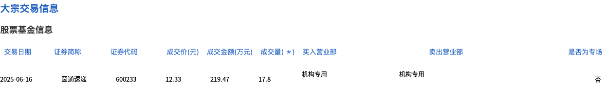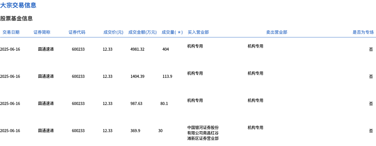 6月16日,圆通速递大宗交易成交645.8万股,成交额7962.71万元,占当日总成交额的18.52%,成交价12.33元,较市场收盘价13.05元折价5.52%。