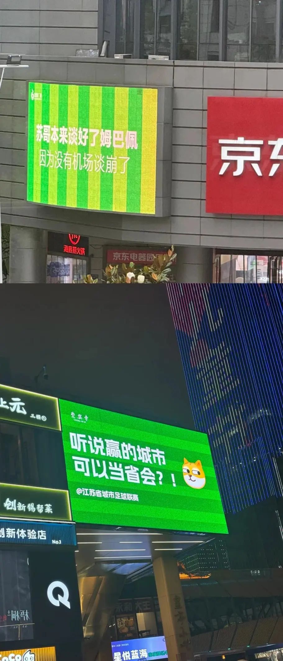 苏超期间,最常见的场景当属各个城市在商场大屏的投放广告了。这边苏州“本来谈好了姆巴佩,因为没有机场谈崩了”调侃自家没机场,那边常州接了输一场少一个笔画的“巾州加油”梗,以及各地“赢的城市当省会”“没有假赛只有恩怨”的地域恩仇……本地网友热衷于收集苏超在各地商场的大屏投放,并在网络社区互相传播分享,而大屏内容的幽默诙谐也不断为苏超话题的丰富度推波助澜。