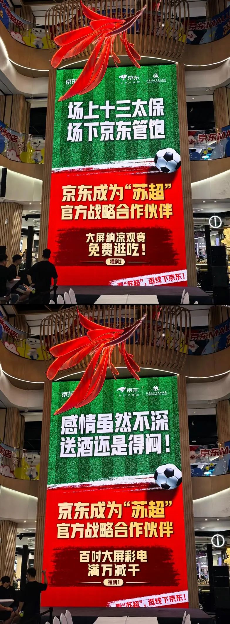 京东瞅准了苏超这一独特的传播方式,率先推出了一波模仿性的玩梗海报,把苏超梗巧妙融合进品牌广告之中。“场上十三太保,场下京东管饱”赢江苏城市特产,“感情虽然不深,送酒还是得闷”一分钱送10000罐啤酒等专属活动,以及针对城市特色美食打出的广告,将话题焦点与产品特征完美结合起来了。商圈大屏本身醒目的视觉效果加上话题度拉满的内容,叠加各城市的联动效应,京东成功将公众的注意力从赛事转移到了品牌身上,品牌曝光度也随之不断放大。