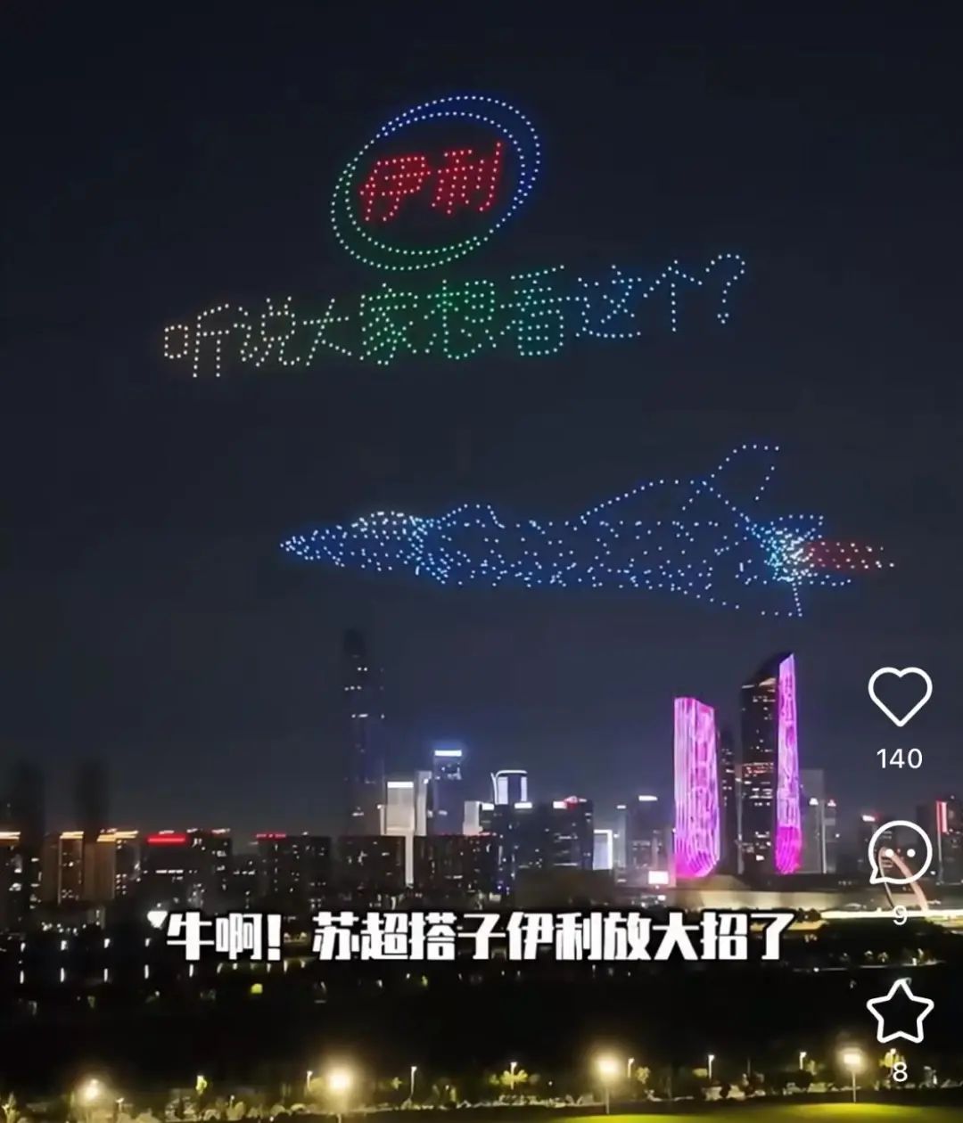 大屏广告之外,伊利还有更加多维立体的营销玩法。没有京东与江苏的“家乡情怀”加持,伊利就请来“苏大强”饰演者倪大红为同有“苏大强”之称的江苏加油助威,还带来无人机表演,给足了苏超“排面”。同时开启了其最拿手的谐音梗——“和苏大强官宣了,不设三天可见的那种”、“苏超群聊申请+1(散装江苏会有群吗?)”,打出了一系列“朋友式”的情感营销。