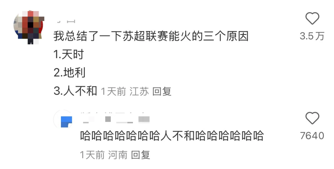 在“江苏十三太保”的文化背景下,苏超最先出圈的是“比赛第一,友谊第十四”的口号。此后,随之而来的是苏超热梗井喷式的生产和在互联网上的爆火,不论是南通VS南京的“南哥之争”,宿迁与徐州横贯古今的“楚汉之争”,还是常州输一场就删一笔画最后直接变成“|州”……不相上下的经济实力,让江苏省每个地级市都剑拔弩张、互不相让,于是网友总结出了苏超能火的原因——天时,地利,人不和。