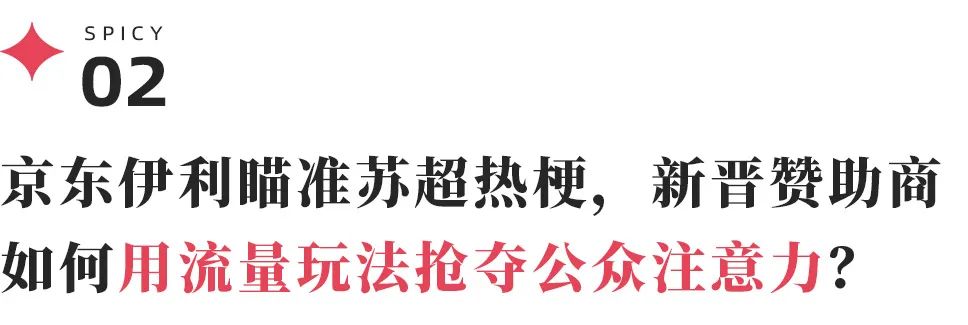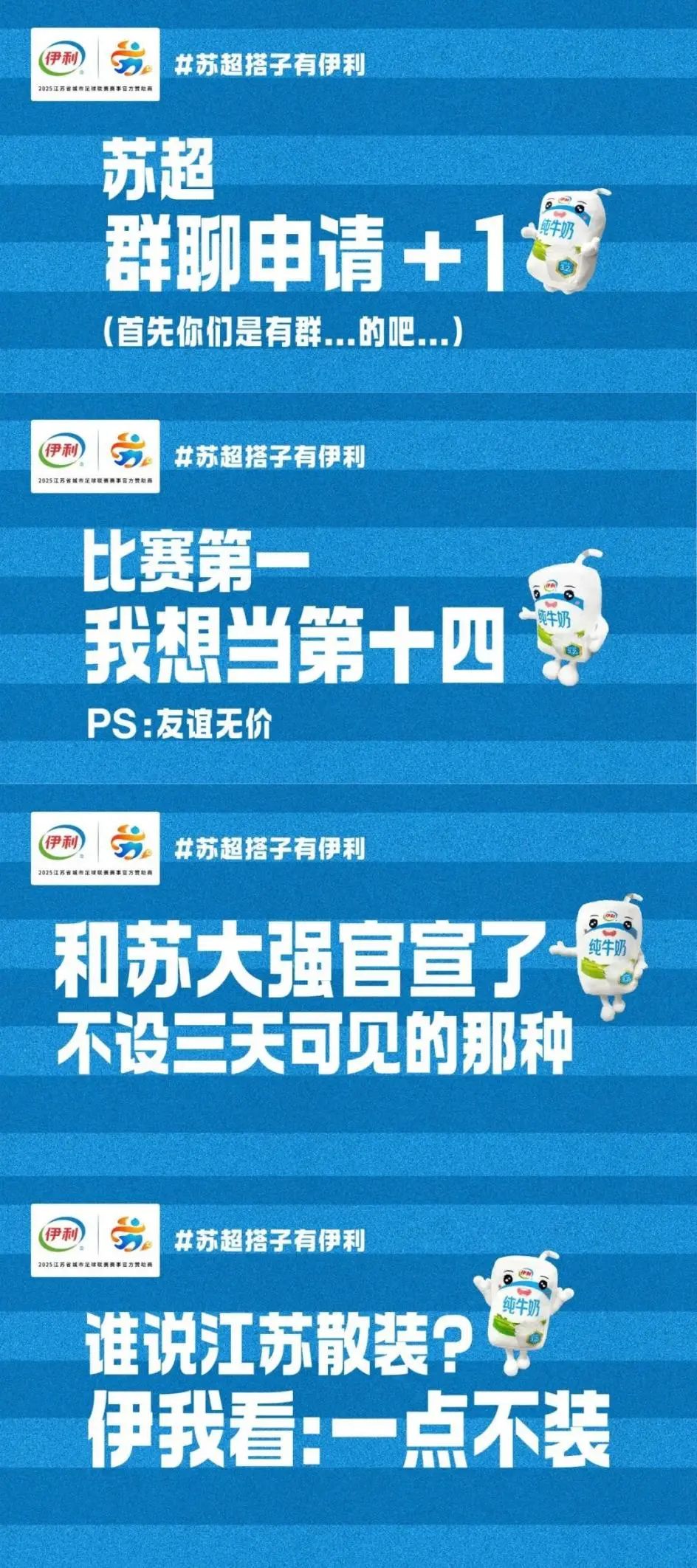 除了初始的本土企业外,赞助商队伍中的“后来者”或许更在意赛事的流量转化。京东率先在线上线下两端发力,玩梗海报铺满网络平台和商场大屏;伊利不甘示弱,请来“苏大强”做苏超搭子,旗下子品牌也跟上了玩梗的脚步。
