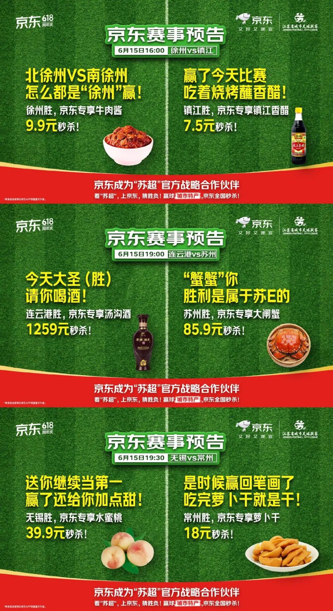 其实除了表面上的玩梗,京东这个企业本身也与江苏有着深刻渊源。早在苏超爆火之初,许多网友就开始喊话,让出身江苏宿迁的京东创始人刘强东加盟赞助,于是靠着消费者天然的情感认同,京东又来了一次听劝营销。但在入局赞助之后,京东并没有着眼与宿迁的情怀营销,而是将各个城市的特色都囊括其中,将品牌与地域的情感联结辐射到更大的地理范围,这也是其营销策略的聪明之处。