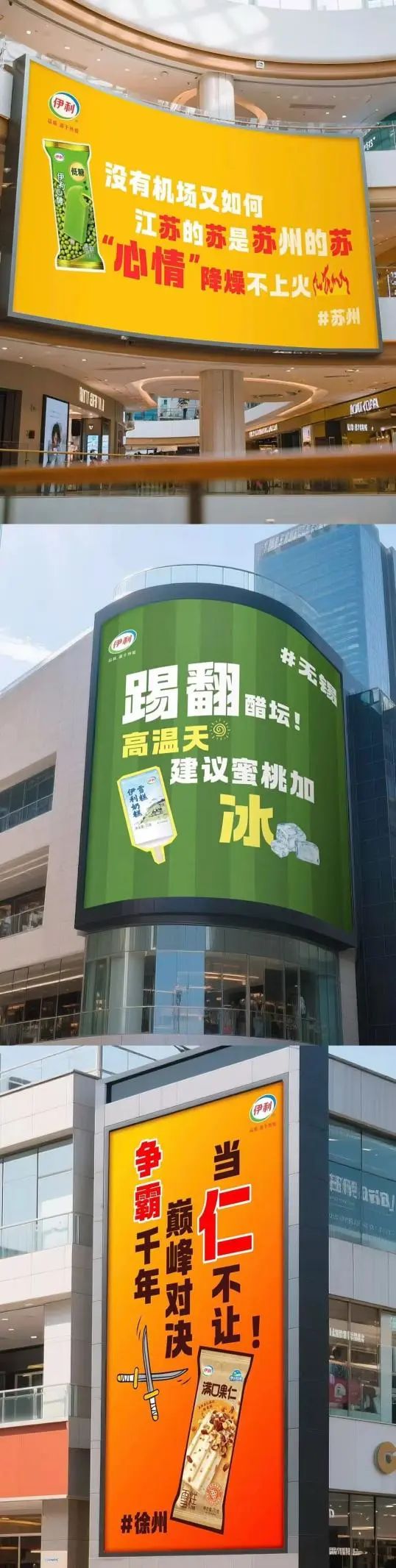 除了京东,“玩梗老手”伊利也盯上了商场大屏的传播效果,联动旗下子品牌伊利冰淇淋和伊刻活泉,在线下搭建起了产品覆盖范围更广的营销矩阵。在苏州,伊利绿色心情雪糕说“没有机场又如何,江苏的苏是苏州的苏,‘心情’降噪不上火”,到了无锡,伊利奶糕的口号则是“踢翻醋坛,高温天蜜桃加冰”。