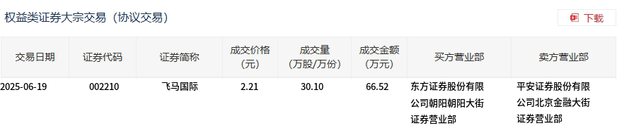 6月19日,飞马国际大宗交易成交30.1万股,成交额66.52万元,占当日总成交额的0.24%,成交价2.21元,较市场收盘价2.46元折价10.16%。