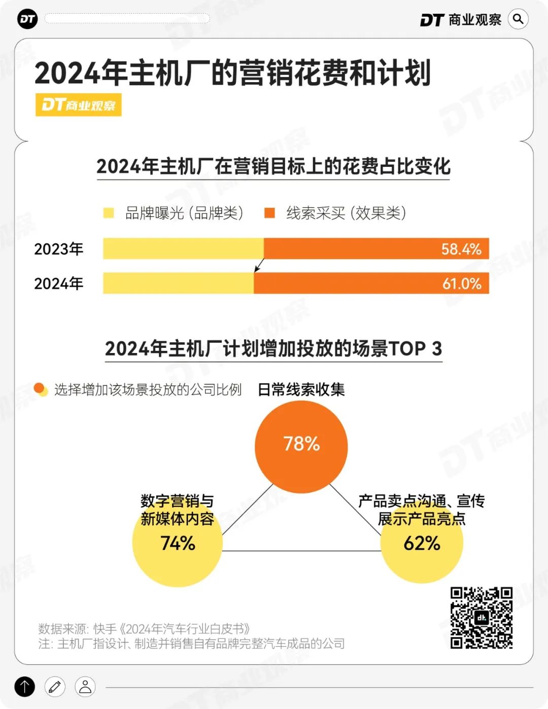 参考快手《2024年汽车行业白皮书》,主机厂在2024年提升了线索采买类广告花费的占比;在投放场景上,78%的主机厂计划增加关于日常线索收集的投放。