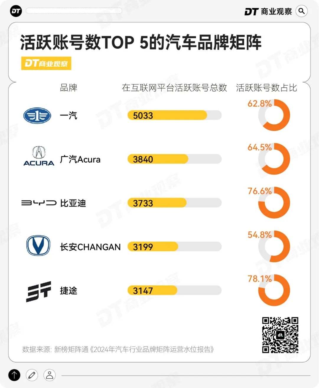 根据新榜矩阵通的统计,捷途是2024年活跃账号数TOP 5品牌中,活跃账号占比最高的,达到78.1%。
