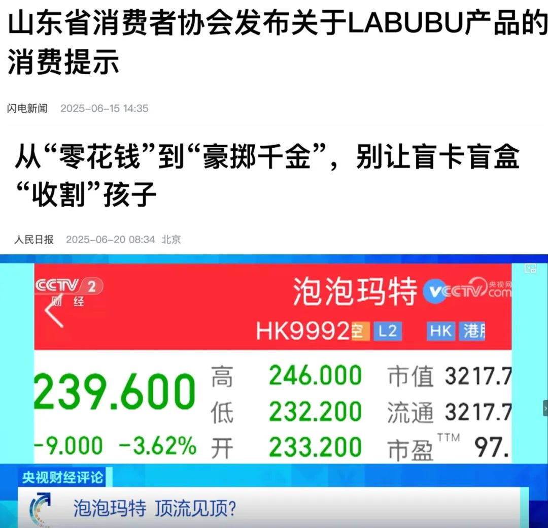 这也是为什么,Labubu会在6月中旬到达狂欢顶峰时,接连被消费者协会、人民日报、中央电视台轮番点名批评。