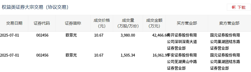 7月1日,欧菲光大宗交易成交5485.34万股,成交额5.85亿元,占当日总成交额的44.62%,成交价10.67元,较市场收盘价11.76元折价9.27%。