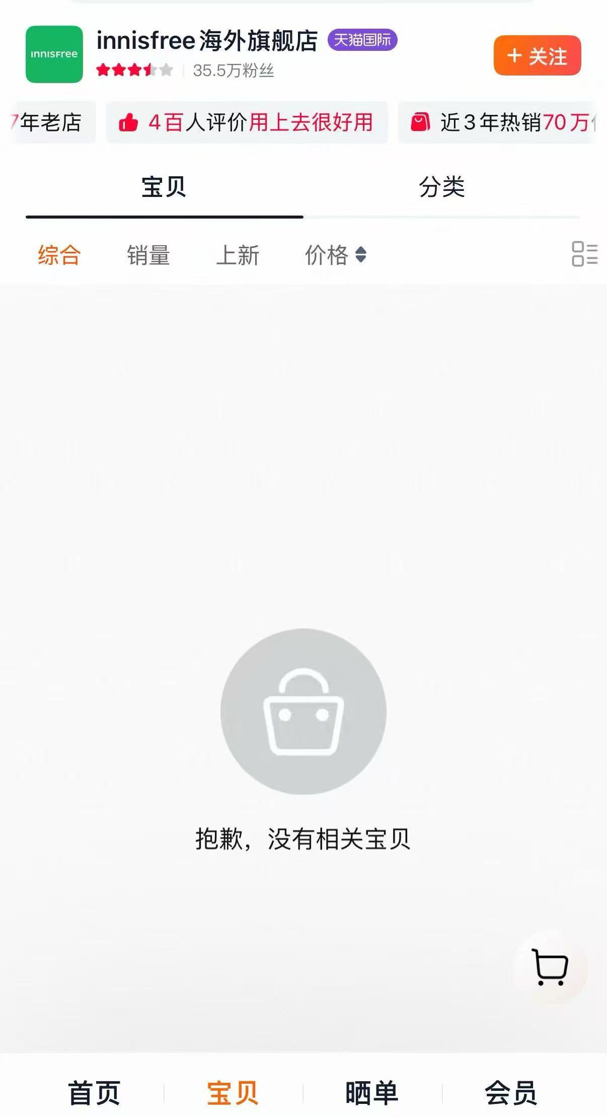 7月1日,社交媒体上传出关于“悦诗风吟海外旗舰店闭店”的消息,化妆品报随即查询到该店商品已全部下架,目前显示该店铺粉丝数为35.5万人。