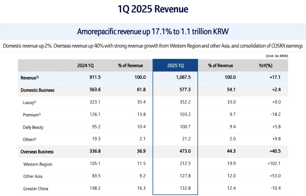 然而,从爱茉莉太平洋最新发布的2025年Q1业绩报告来看,集团海外销售表现强劲,同比增长40.5%至4730亿韩元(约合人民币25.02亿元),除大中华区外,在其他海外市场均实现增长。