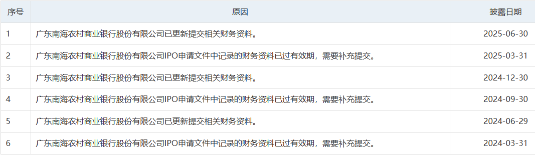 2023年2月,南海农商行董事会通过了《关于广东南海农村商业银行股份有限公司首次公开发行境内人民币普通股(A 股)股票并在主板上市的议案》,同年3月递交了招股说明书。不过2024年3月以来,该行已经连续三次因为“财务资料过期”而导致IPO审核被中止。