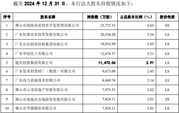 截至2024年末,南海农商行共有法人股东56名,占发行前总股本的53.88%,自然人股东10860名,占发行前总股本的46.12%,持股5%以上的仅3家,最高持股比例6.03%,股权分散程度可见一斑。
